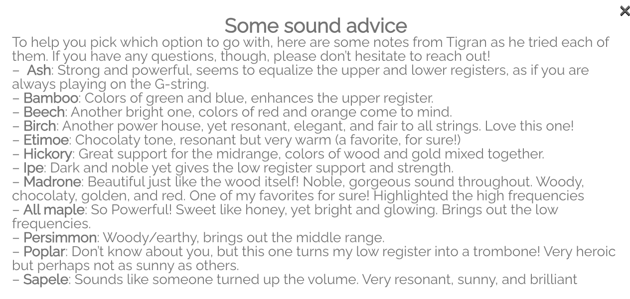 So each wood type, in addition to looking different, offers a slightly different sound. Tigran provides his observations on the different sounds of each wood here: